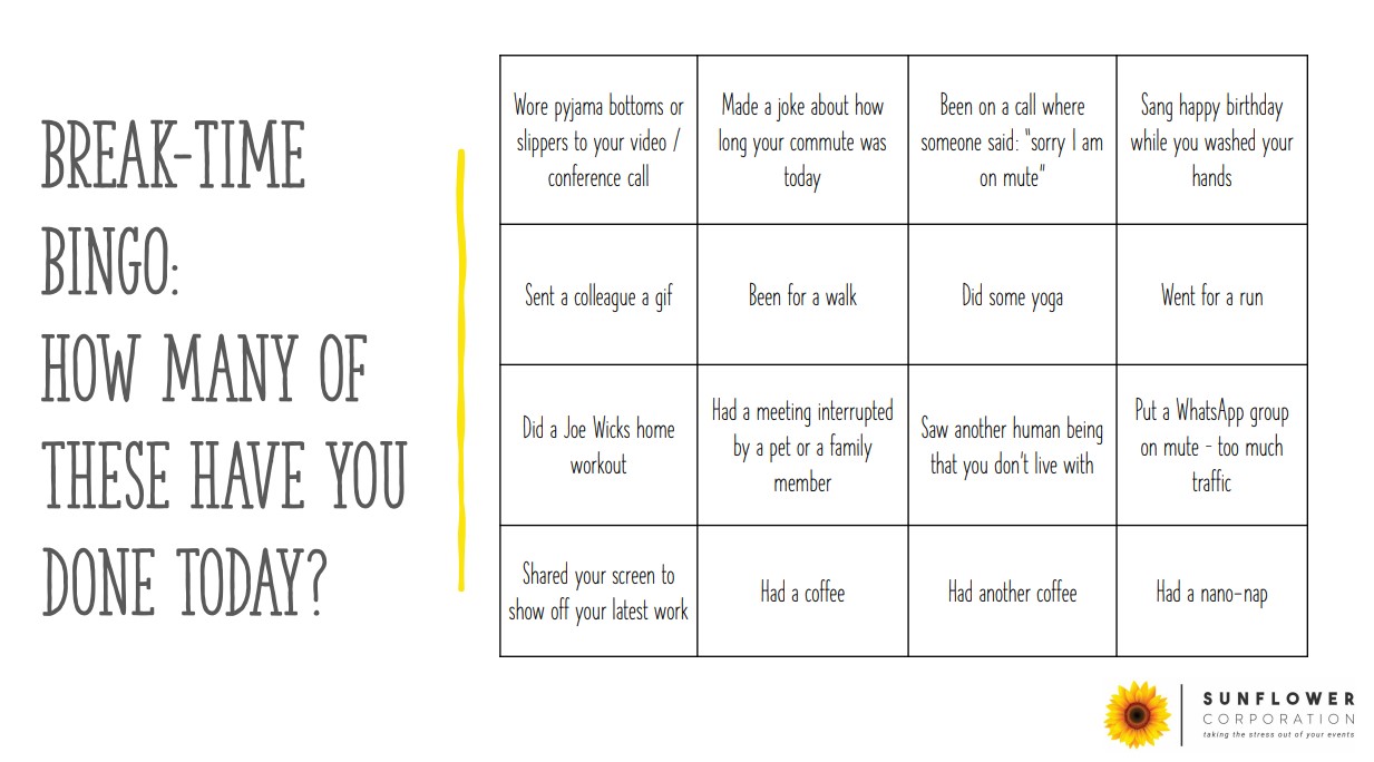 The @SunflowerEventTeam have been brainstorming (virtually, of course) how we can reach out to our clients to help keep themselves and their colleagues sane during the lockdown and coronavirus crisis.